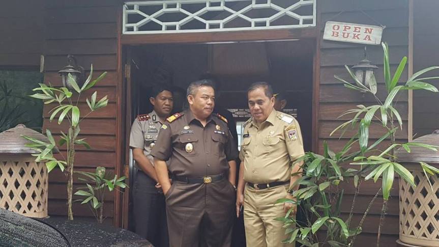 Minahasa – Bupati Minahasa Drs Jantje Wowiling Sajow MSi menjamu lewat makan siang bersama, Kepala Kejaksaan Tinggi (Kajati) Sulawesi Utara (Sulut) Mangihut Sinaga SH, saat berkunjung ke Kabupaten Minahasa, Senin (20/03), di Restaurant Tumou Tou Pinggir Danau Tondano.