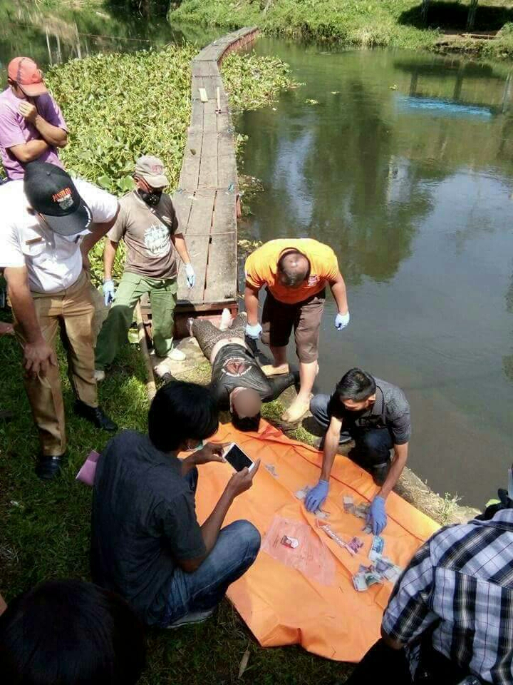 Diceritakannya, saat dia tengah membersihkan eceng gondok dengan menggunakan bambu tepat dijembatan terapung dilokasi TKP, dia terkejut saat melihat ada mayat yang terapung hampir tertutupi dengan eceng gondok.