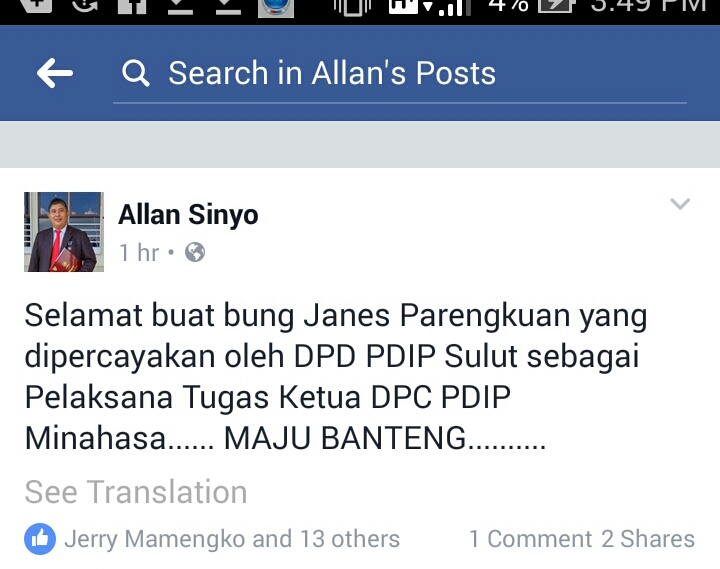 Dalam akun Facebook miliknya, Parinusa menulis ” Selamat buat bung Janes Parengkuan yang dipercayakan oleh DPD PDIP Sulut sebagai Pelaksana Tugas Ketua DPC PDIP Minahasa…… MAJU BANTENG……….”