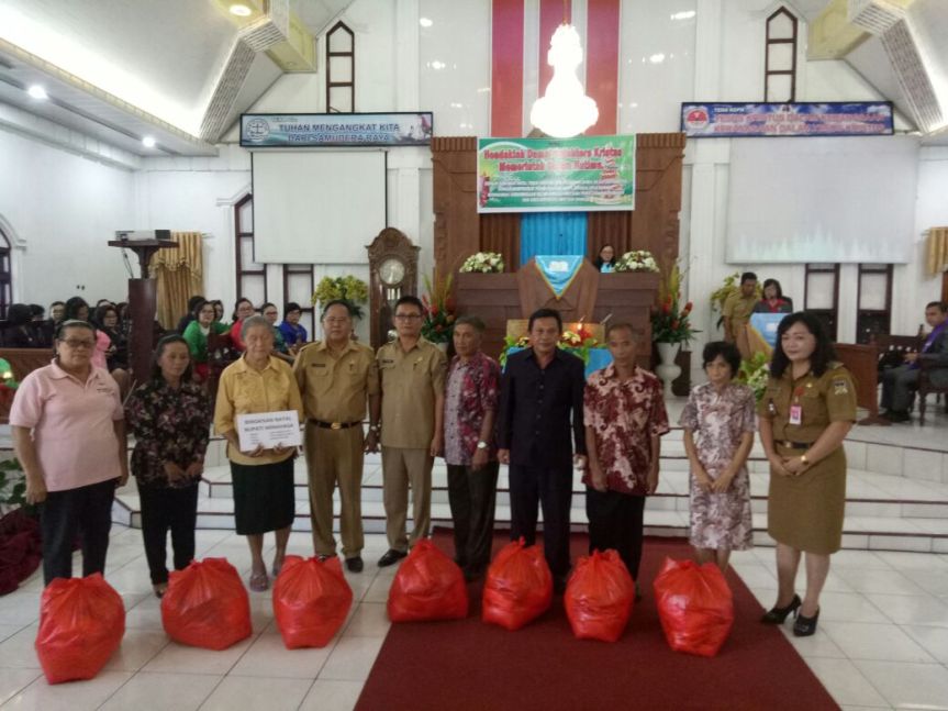 Selanjutnya dilakukan penyerahan bingkisan Natal dari Pemkab Minahasa yang diserahkan langsung secara sombolis oleh Sekda Jeffry Korengkeng MSi kepada lansia dan masyarakat yang kurang mampu.