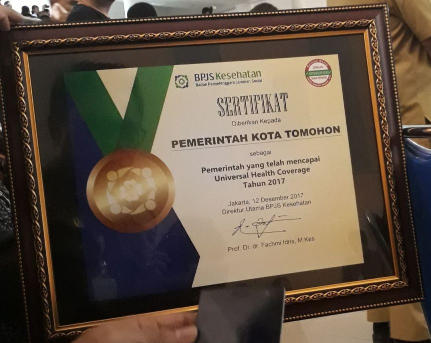 Kesempatan itu juga Pemerintah Kota Tomohon memperoleh berupa Sertifikat Universal Health Coverage tahun 2017.