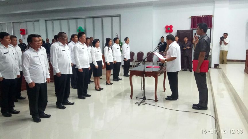 Tondano – Bupati Minahasa Drs Jantje W Sajow M.Si, melantik 19 pejabat, masing-masing jabatan administrator, jabatan pengawas, dan jabatan fungsional pengawas penyelenggaraan urusan pemerintahan daerah di Inspektorat Daerah Kabupaten Minahasa, hari ini Selasa (16/01/2018).
