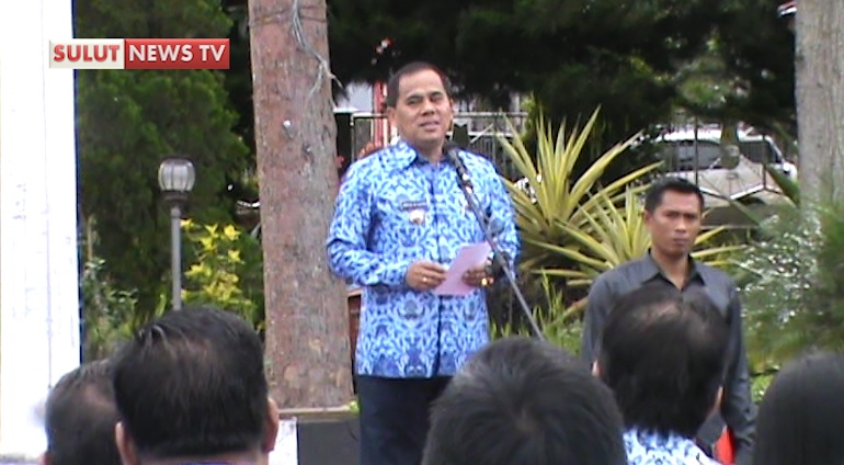 Bupati Minahasa Drs. Jantje Wowiling Sajow, MSi, Memimpin Apel KORPRI di lingkup Pemkab Minahasa Rabu 17 Januari 2018 di halaman Kantor Bupati Tondano.