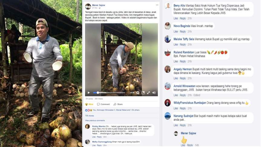 Minahasa – Bupati Minahasa Jantje Wowiling Sajow (JWS) Kamis pagi (18/1/2018), lewat akun facebook pribadinya bernama “Mener Sajow”, mengunggah sebuah video yang memperlihatkan dirinya sementara melakukan aktifitas mengupas kelapa secara tradisional.