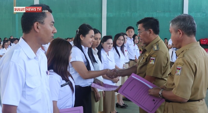 Tondano – Penjabat Bupati Minahasa Drs. Royke H. Mewoh, DEA, melakukan kunjungan kerja di Kecamatan Tondano Raya, didampingi Kadis Pendisikan Dr. Arody Tangkere, MAP menyerahkan Surat Keputusan Bupati kepada 263 guru honorer yang dipusatkan di tenis Indoor Sasaran.