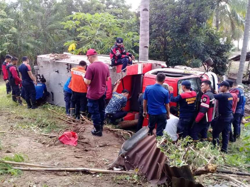 Naasnya saat dipertigaan jalan trans 1, salah satu unit Damkar terguling dan 8 personil mengalami luka ringan.