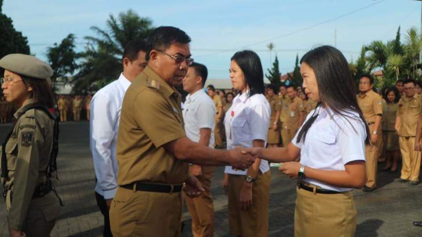 Tondano – Penjabat Bupati Minahasa Drs Royke H Mewoh menyerahkan 3.017 Kartu BPJS Ketenagakerjaan Non ASN kepada Honorer di pemkab Minahasa saat Apel awal bulan agustus, Senin 06/08/18 di halaman kantor bupati tondano.