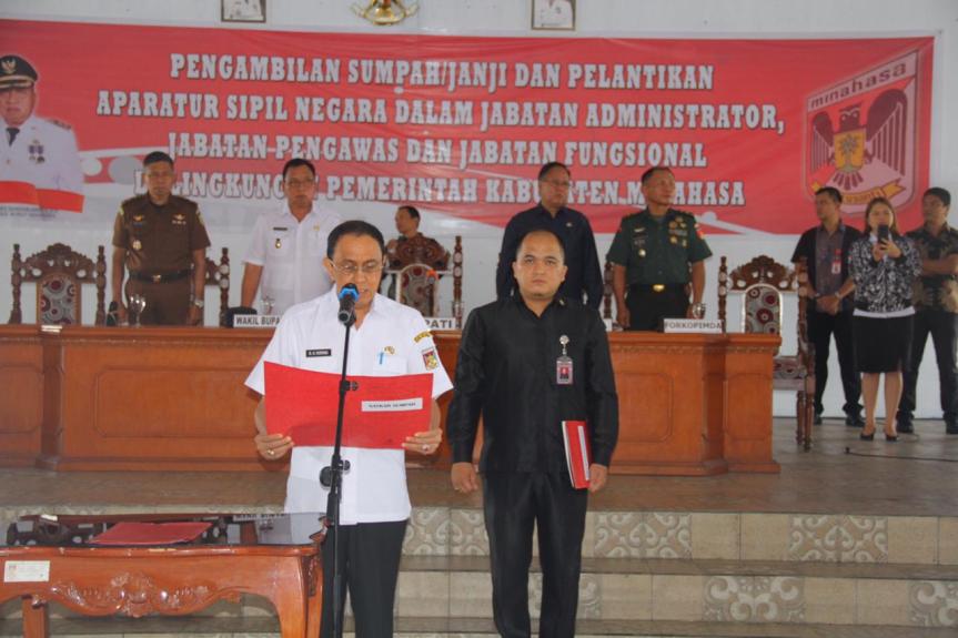 Tondano – Bupati Minahasa Ir Royke Octavian Roring M.Si melantik langsung sebanyak 82 Pejabat esalon III dan IV. Dan dalam pelantikan ini juga diserahkan nota dinas pelaksana tugas bagi 12 Pejabat Rabu (6/2/2019) di Aula Wisata Benteng Moraya Tondano.