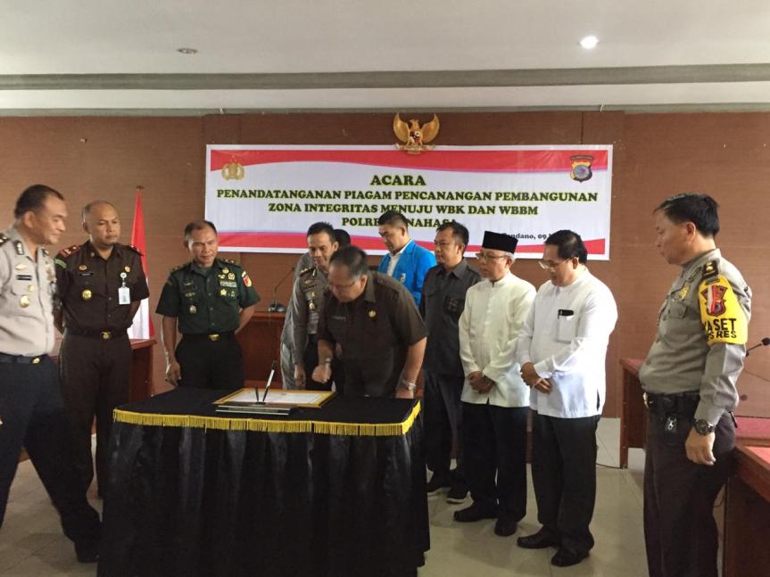 Minahasa – Sekretaris Daerah Kabupaten Minahasa Jeffry R Korengkeng SH MSi Menghadiri Penandatanganan Piagam Pencanangan Pembangunan Zona Integritas Menuju WBK dan WBBM Polres Minahasa Kamis, 9 Mei 2019