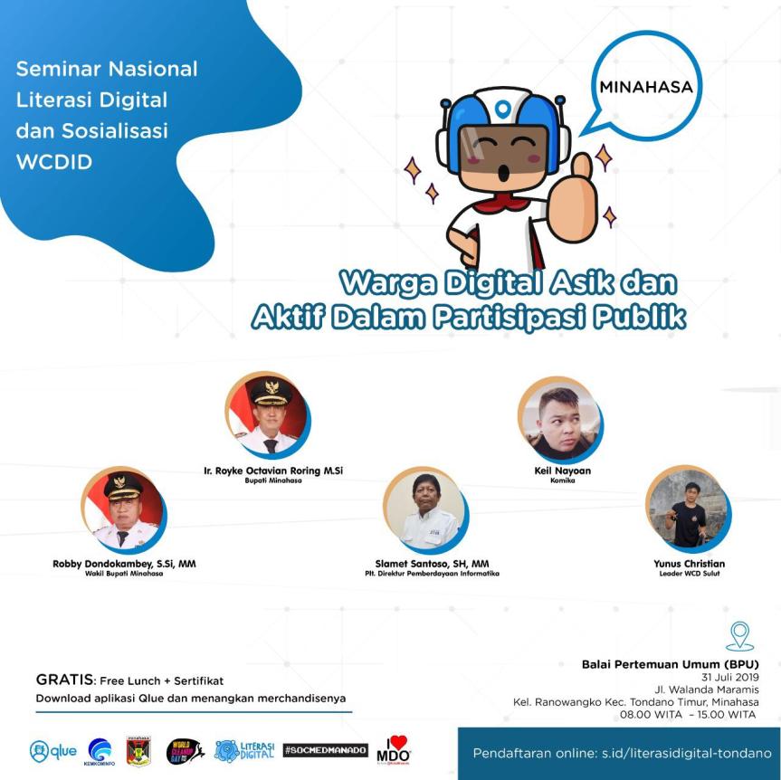 Dikatakan Tumundo bahwa Seminar Nasional yang mengambil tema “Warga Digital Asik dan Aktif dalam Partisipasi Publik” yang dirangkaikan dengan Sosialisasi World Cleanup Day (WCD) ini, akan menghadirkan Nara Sumber diantaranya Direktur Pemberdayaan Informatika Kemenkominfo RI Slamet Santoso SH MM, Komika Keil Najoan dan Leader WCD Sulut Yunus Christian.