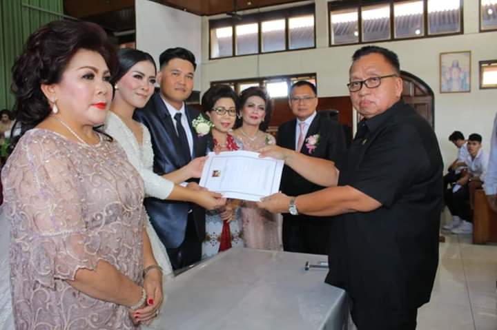 Pemberkatan Nikah dipimpin oleh Pdt. Vanny Arina-Suoth, M.Th, dan yang menjadi saksi dari mempelai wanita Ketua Tim Penggerak PKK Kabupaten Minahasa Dra. Fenny Roring-Lumanauw, SIP, sedangkan saksi dari mempelai pria Rektor Unima Dr. Julyeta Paulina Amelia Runtuwene, MS, DEA, turut hadir Kadis Capil Minahasa Drs. Luvy Rumate.