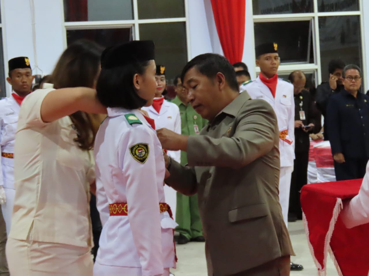 Pengukuhan para pasukan Paskibraka, diawali dengan menyanyikan lagu Indonesia Raya, dilanjutkan dengan pembacaan ikrar yang dibacakan oleh Kepala Dinas Pemuda dan Olahraga Djelly Waruis. Pemasangan Kendi oleh Bupati kepada perwakilan personil Paskibrakan sebagai tanda telah siap menjalankan tugas negara.