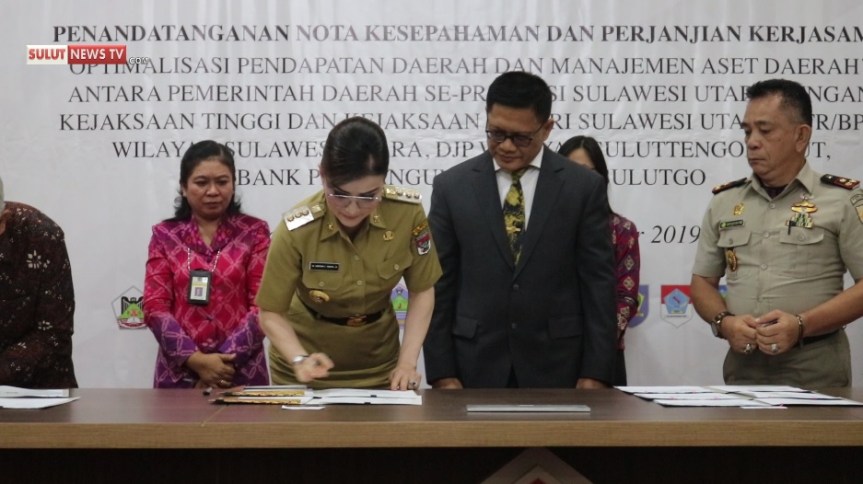 Bupati Minahasa Selatan Christiany Eugenia Paruntu menandatangani Nota Kesepahaman dan kerjasama Optimalisasi Pendapatan Daerah dihadapan Pimpina KPK dan Gubernur Sulut