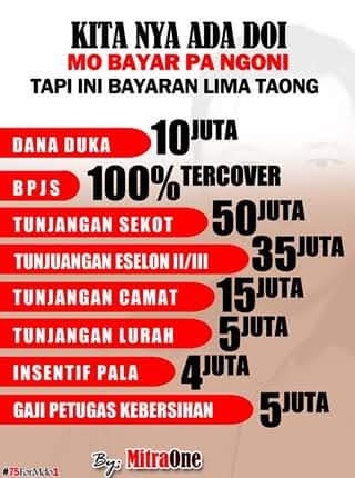 Manado – Langkah James Sumendap untuk bertarung di Pemilihan Walikota (Pilwako) Manado hampir dipastikan. Terbaru, politisi yang biasa disapa JS itupun memaparkan sebagian programnya jika dipercayakan sebagai Manado Satu nantinya. Salah satu yang menarik yaitu Program Tunjangan Dana Duka yang mencapai Rp 10 Juta. Selain itu gaji kepala lingkungan (pala) bakal dinaikan JS menjadi empat juta, hingga gaji para petugas sampahpun dinaikkan menjadi 5 juta.