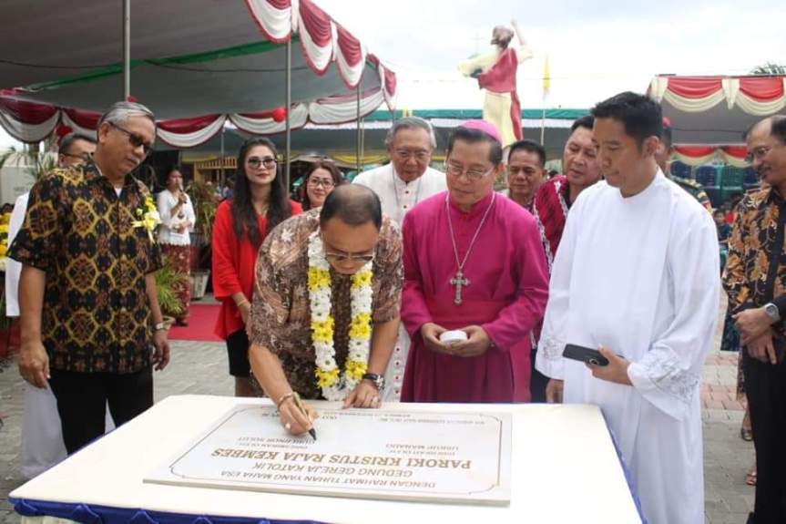 Minahasa – Bupati Minahasa Ir. Royke Octavian Roring M.Si menghadiri acara peresmian Gereja Katolik Paroki Kristus Raja Kembes yang di rangkaikan dengan peletakan batu pertama pembangunan Pastoral Kristus Raja kembes kecamatan Tombulu
