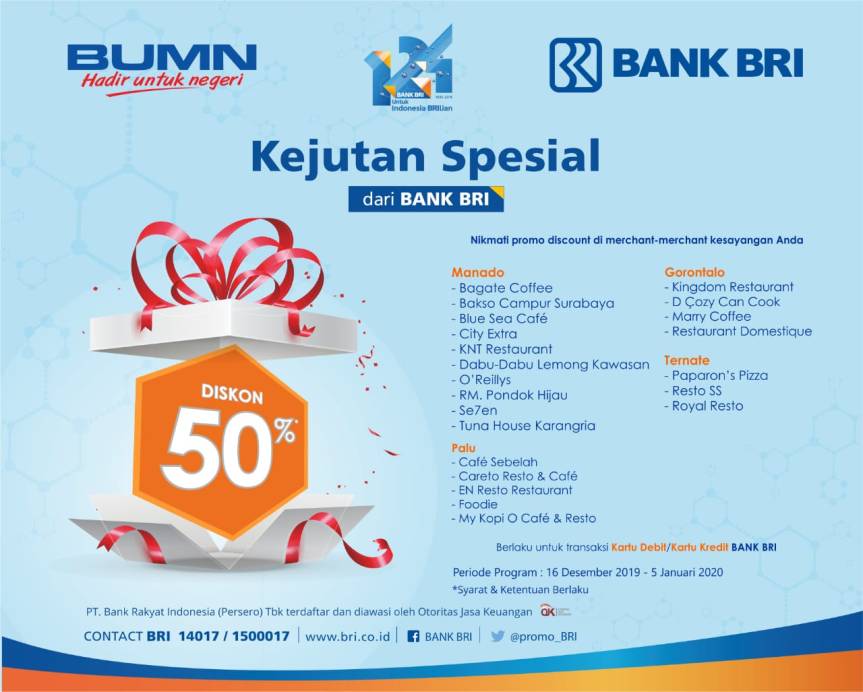 “Jadi memang untuk memperingati HUT Bank BRI, kami memberikan promo special diskon hingga 50 persen dimercant-mercant tertentu,” tutur Pgs Pemimpin Wilayah BRI Manado I Made Surya Artana kepada Sulutnewstv.com, Jumat(13/12).
