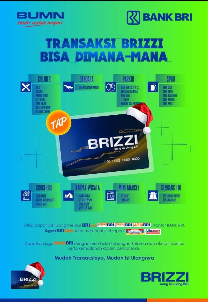 Mendukung hal itu, PT. Bank Rakyat Indonesia (Persero, Tbk) Kantor Wilayah Manado pun tengah siap dengan ribuan kartu Brizzi milik BRI, yang tujuannya untuk memberikan kemudahan bagi masyarakat Sulawesi Utara, khususnya di Manado.