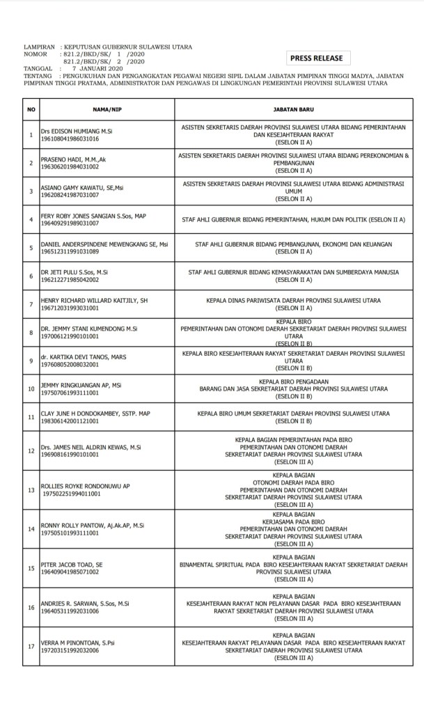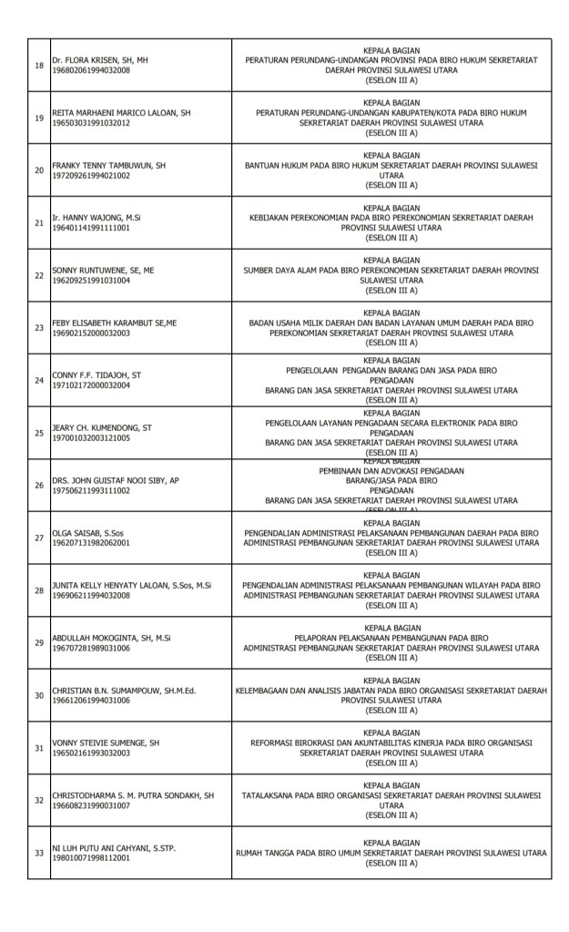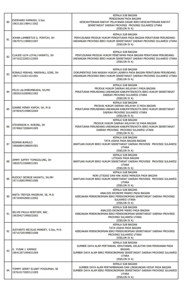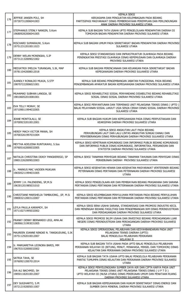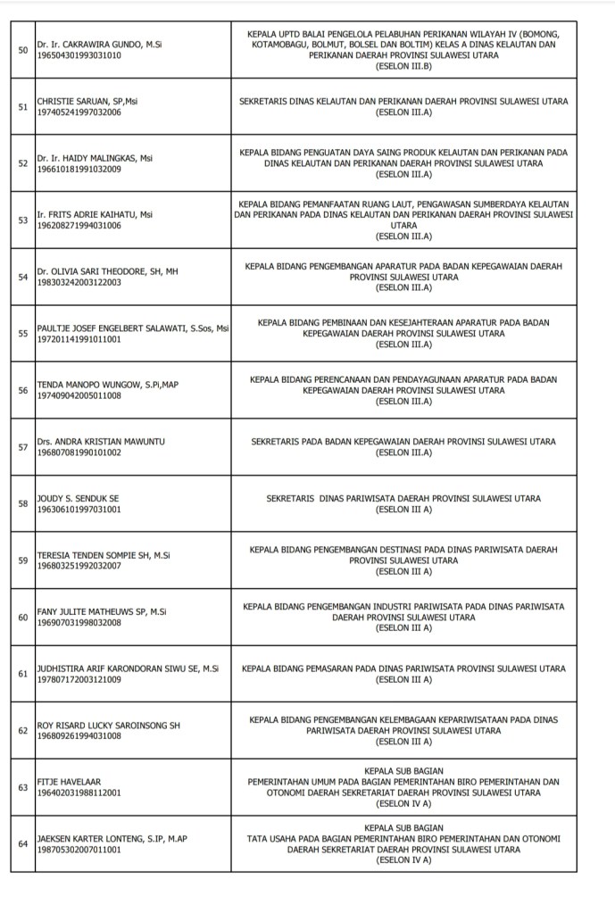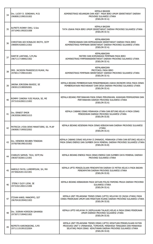 Berikut daftar nama-nama serta jabatan pejabat Eselon II, III dan IV serta Kepala Sekolah SMA/SMK/SLB yang berlangsung di Aula Mapalus Kantor Gubernur Sulawesi Utara :