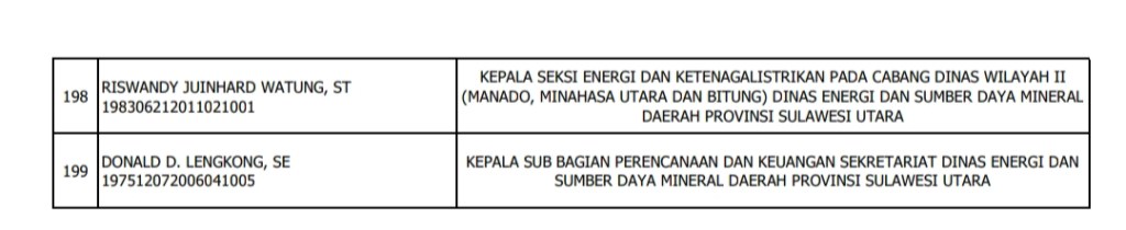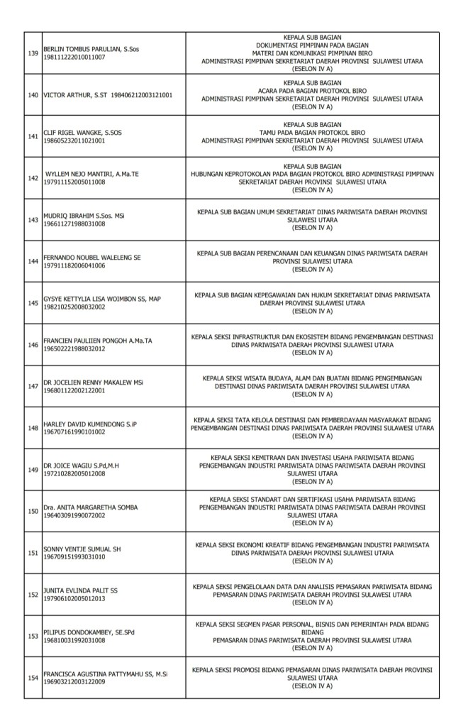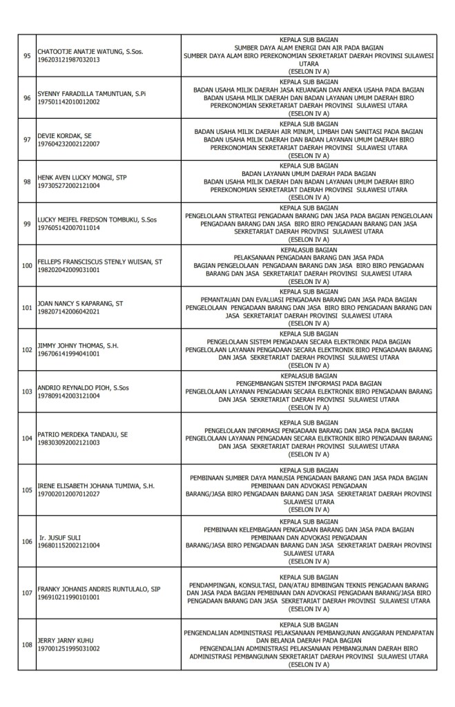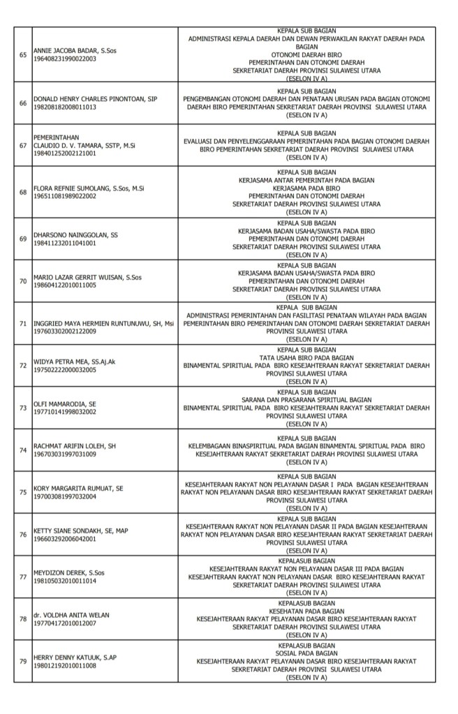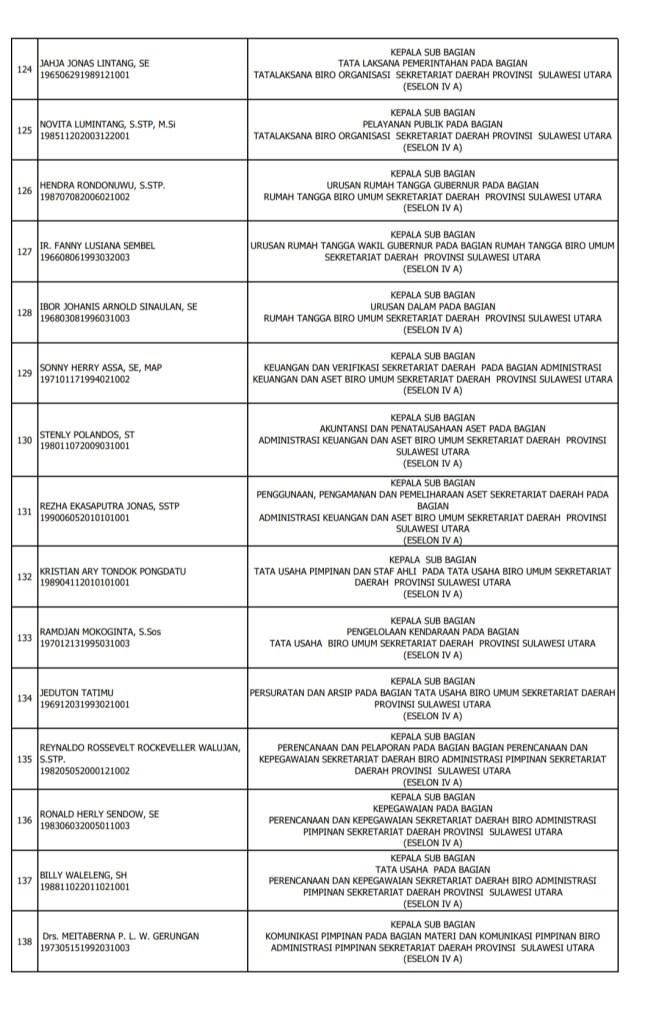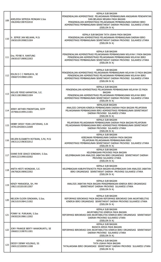 Berikut daftar nama-nama serta jabatan pejabat Eselon II, III dan IV serta Kepala Sekolah SMA/SMK/SLB yang berlangsung di Aula Mapalus Kantor Gubernur Sulawesi Utara :