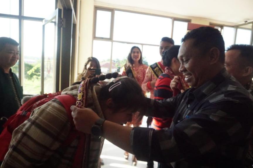 Seperti biasa, tim Manajemen Bandara Sam Ratulangi Manado kembali menyambut para penumpang asal tirai bambu ini dengan menyerahkan bingkisan dan secara simbolis dilakukan pengalungan kain bentenan bagi perwakilan cabin crew dan penumpang sebagai simbol keramahtamahan serta ucapan selamat datang di Sulawesi Utara.
