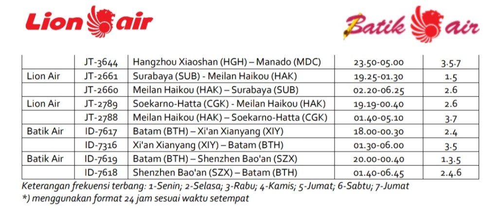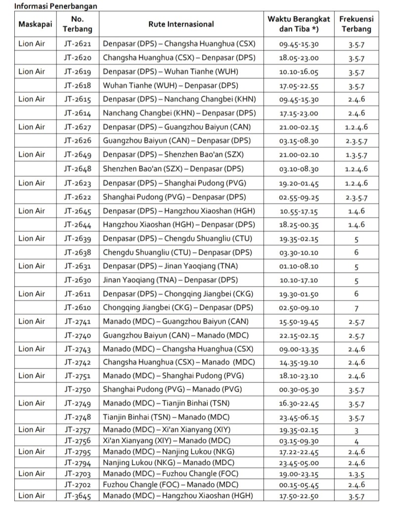 Menurut rilis yang dikirimkan langsung oleh pihak Lion Air Group, jadwal keberangkatan dan kedatangan hingga pemberitahuan lebih lanjut (until further notice), dengan keterangan: