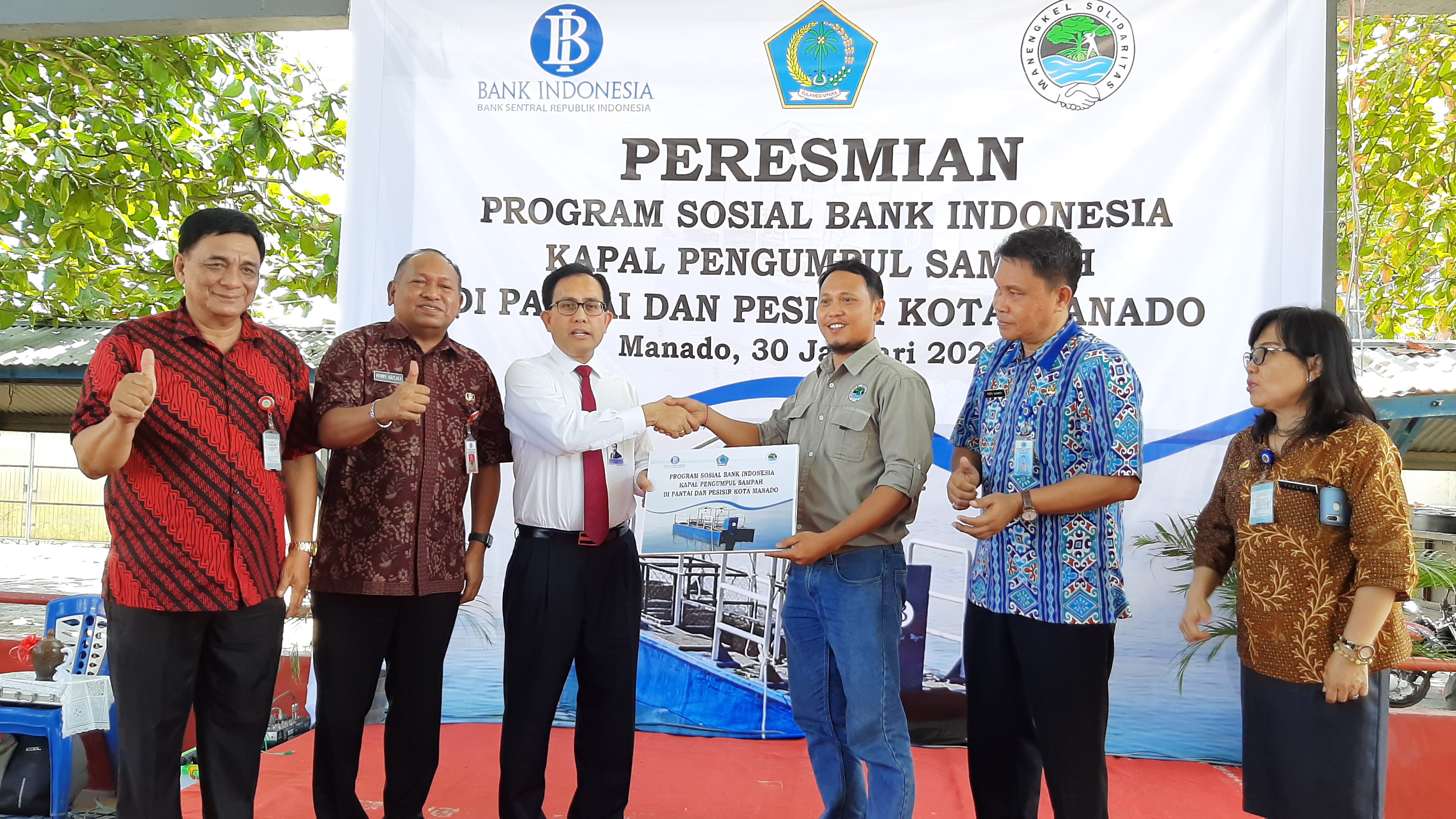 SULUTNEWSTV.com, MANADO – Sebagai upaya untuk melestarikan wilayah Sulut khususnya di Kota Manado, Kantor Perwakilan Bank Indonesia Sulawesi Utara mengibahkan satu unit kapal pengumpul sampah.