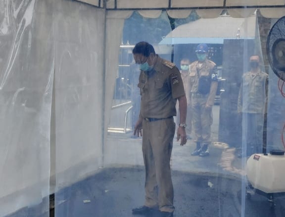 Setiap tamu maupun pegawai Pemkab Minahasa yang masuk, harus melewati bilik disinfektan di pintu masuk akses Kantor Bupati, serta diharuskan menyemprotkan hand sanitizer dan wajib menggunakan masker yang dianjurkan untuk pencegahan Covid19. Bupati Minahasa pun ketika memasuki kantor bupati tetap melaksanakan protokoler kesehatan. (ChristianT)