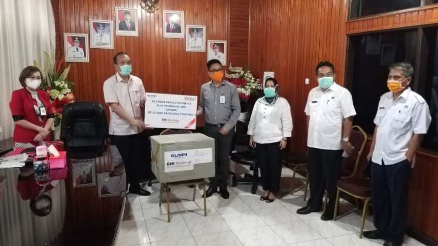 Head of Region BNI Wilayah Manado Koko Prawira Butar-Butar melalui Pemimpin Cabang Tomohon Danel Kereh yang didampingi Pemimpin BNI Kantor Cabang Pembantu Tondano Lidya Lumintang menyebut penyaluran 50 APD Kesehatan BNI kali ini diarahkan pada Rumah Sakit (RS) yang diterima langsung oleh Sekertaris Daerah Pemerintah Kabupaten Minahasa Frits Muntu, S.Sos didampingi Direktur RSUD Sam Ratulangi dr. Mariani Suronoto, Asisten Bidang Ekonomi dan Pembangunan Setdakab Ir. Wenny Talumewo dan Kadis Sosial Royke Kaloh, SH