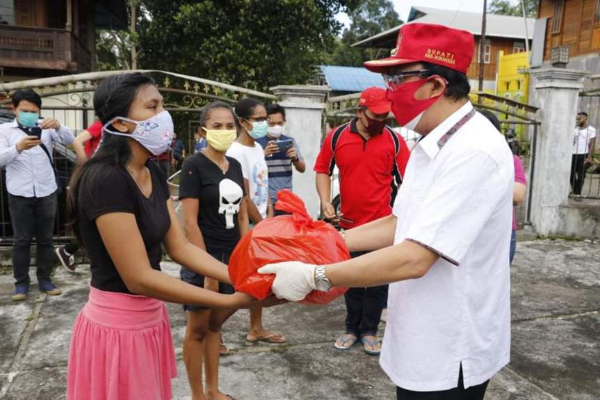 Minahasa – Bupati Minahasa Dr. Ir. Royke Octavian Roring, MSi, bersama Forkopimda Minahasa menyerahkan Bantuan Sosial secara simbolis kepada Mahasiswa UNIMA dari luar daerah yang terdampak Covid-19 (tidak bisa pulang kampung) di Kompleks Asrama Cenderawasih XII Kelurahan Tataaran-Patar Jumat, 8 Mei 2020.
