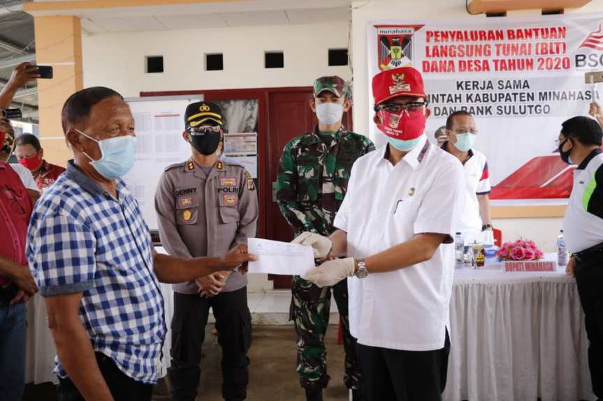 Minahasa – Bupati Minahasa DR. Ir. Royke O. Roring, MSi menyalurkan Bantuan Langsung Tunai (BLT) kepada masyarakat terdampak covid 19 secara simbolis yang bersumber dari Dana Desa (DD), Jumat 8 Mei 2020 di Desa Kembuan Satu Kecamatan Tondano Utara.