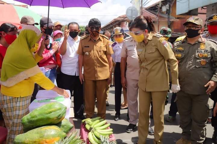 Minsel – Bupati Minahasa Selatan (Minsel) Christiany Eugenia Paruntu, SE, (CEP) meninjau langsung situasi pasar 54 Amurang di masa pandemi Covid-19, Selasa (2/6/2020).