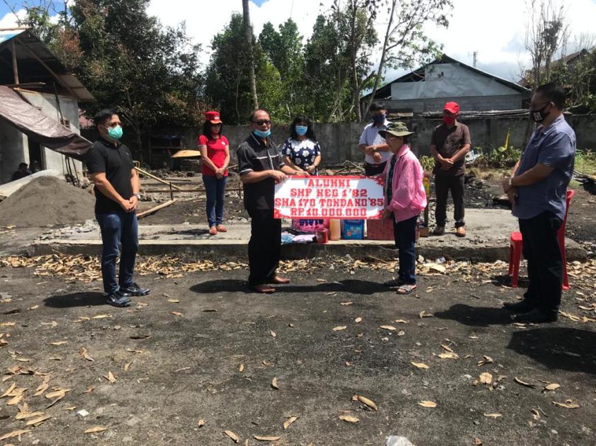 Minahasa – Alumni SMA 170 angkatan 85 dan SMP Negeri 1 Tondano angkatan 82 menyerahkan bantuan kepada Rekan Alumni Aris Waney Keluarga Waney-Sompotan yang mengalami musibah kebakaran rumah di Kelurahan Katinggolan Kec. Tondano Timur, Jumat 5/6/2020.