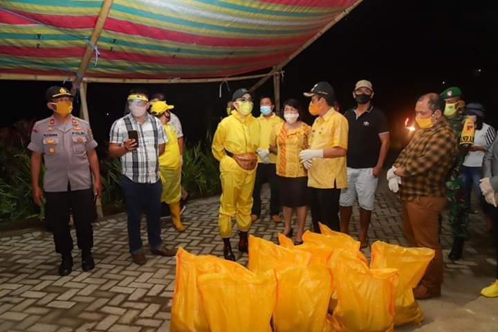 Dalam kunjungannya Bupati Tetty Paruntu memberikan bantuan sembako di desa Raanan Lama yang sedang menjalankan Isolasi mandiri.