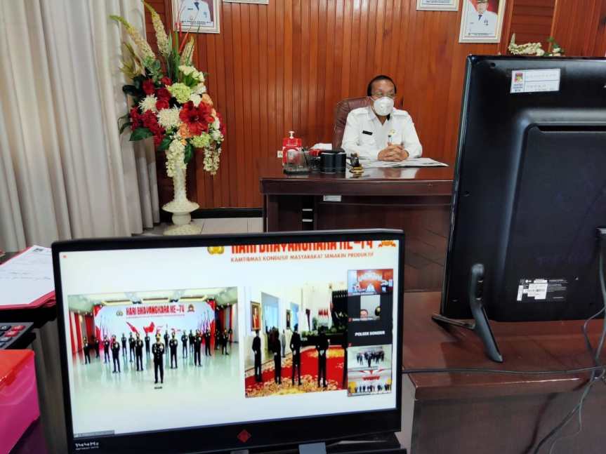 Minahasa – Pemerintah Kabupaten Minahasa dibawah kepemimpinan Bupati Minahasa DR. Ir. Royke O Roring, Msi dan Wakil Bupati Minahasa Robby Dondokambey, Ssi melalui Sekretaris Daerah Kabupaten Minahasa Frits Muntu, S.Sos mengikuti Upacara Hari Bhayangkara ke- 74 via Zoom meeting, Rabu, (01/07)