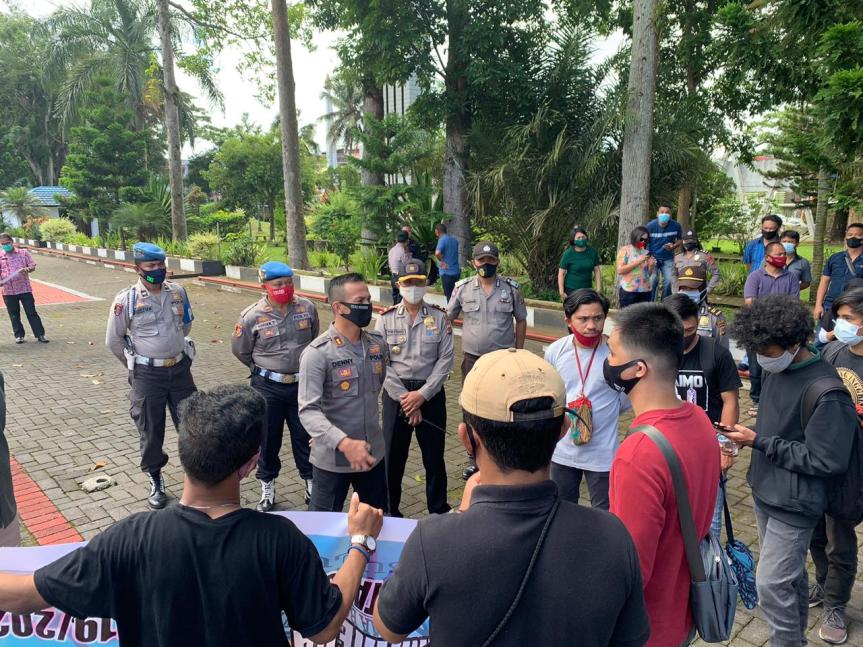 Tondano – Kapolres Minahasa AKBP Denny Situmorang SIK memimpin langsung pengamanan aksi Unjuk Rasa (Unras) sejumlah mahasiswa yang datang menyampaikan sejumlah tuntutan mereka di kantor Bupati, Kamis (16/7/2020).