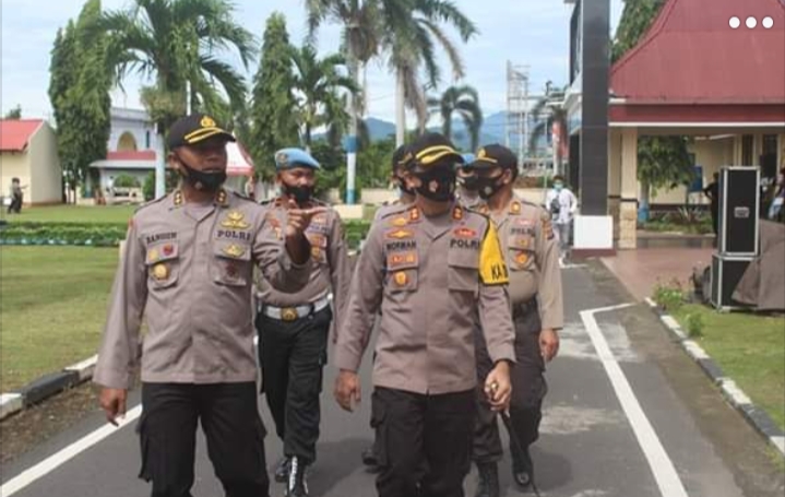 Tiba di gerbang masuk Polres Minsel, Kamis pagi (30/07/2020), AKBP Norman Sitindaon bersama Ketua Cabang Bhayangkari Ny. Heppy Norman, disambut langsung AKBP Bangun Widi Septo, Ny. Maysarah Bangun, Wakapolres Kompol Farly Rewur, para pejabat utama, perwira, personel jajaran serta pengurus Bhayangkari Cabang Minsel.