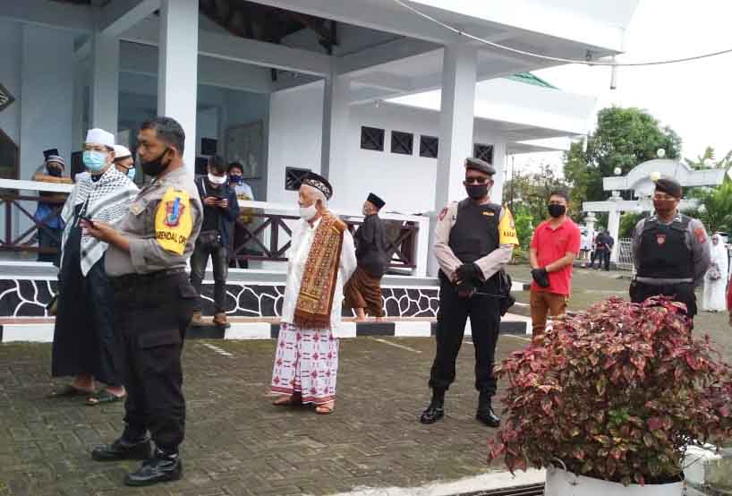 Tondano – Sejumlah aparat kepolisian dari Polres Minahasa mengamankan pelaksanaan perayaan Idul Adha di Mesjid Al Falah Kyai Modjo Kampung Jawa Tondano, Jumat (31/7/2020).