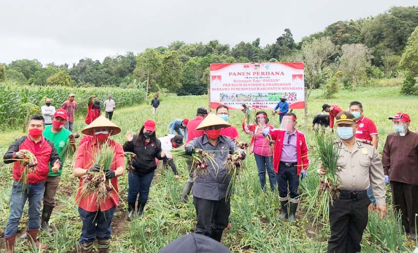 Minahasa – Bupati Minahasa Dr. Ir. Royke Octavian Roring, MSi IPU Asean, Eng dan Ketua KTNA Kabupaten Minahasa Dra. Fenny Ch. M. Roring Lumanauw, SIP dan Wakil Bupati Minahasa Robby Dondokambey, SSi, MM selaku Ketua HKTI Kabupaten Minahasa melakukan panen perdana Bawang Merah varietas Lansuna di Lahan Pertanian Bukit Tompola Milik Kelompok Tani ‘Paulus’ Pria Kaum Bapak KGPM Sentrum Kawangkoan