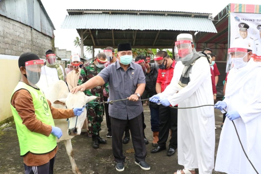 Tondano – Wakil Bupati Minahasa Dr Robby Dondokambey SSi menyerahkan hewan qurban, Dalam Rangka Hari Raya Qurban / Idul Adha 1441 H Tahun 2020 di Masjid AL Hijrah di Kel. Rinegetan Kec. Tondano Barat ; Jumat (31/7/2020)