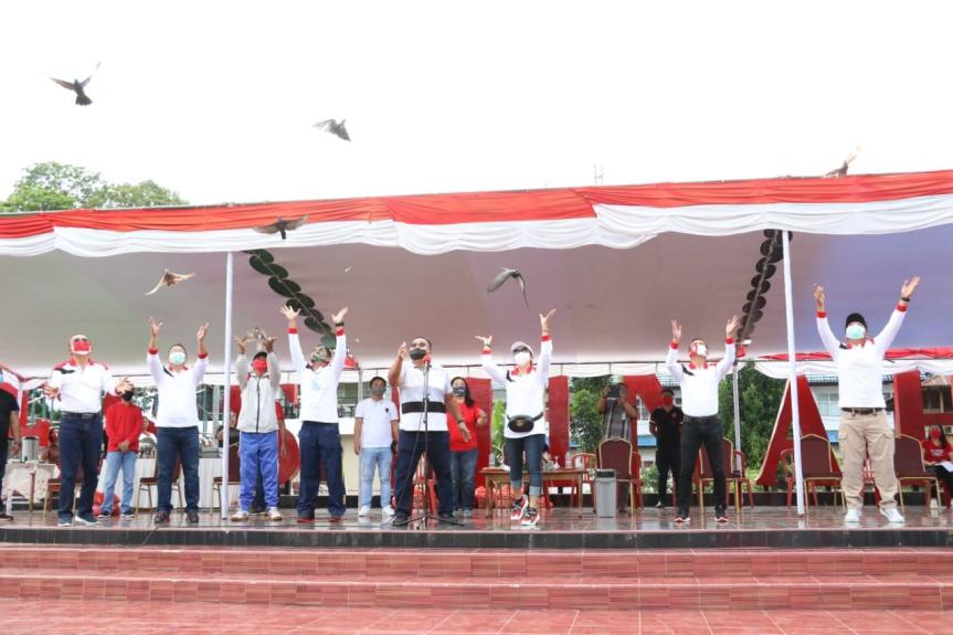 Pembukaan Rangkaian Kegiatan perayaan HUT Proklamasi Republik Indonesia ke-75 ditandai dengan pelepasan Burung merpati dan penanaman pohon dan senam bersama.