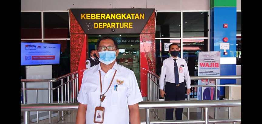 General Manager Minggus Gandeguai beserta jajaran terlihat nampak mengikuti upacara online di Terminal Bandara.