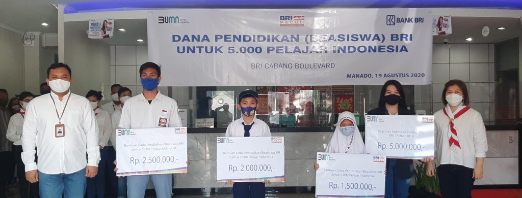 SULUTNEWSTV.com, MANADO – Setelah serentak dilakukan penyerahan simbolis lewat virtual online oleh Kantor Pusat yang dilakukan tepat di Hari Kemerdekaan RI ke-75 tahun, Senin 17 Agustus 2020, Bank BRI melalui BRI Kantor Cabang Boulevard pun mulai menyerahkan bantuan Dana Pendidikan (Beasiswa).