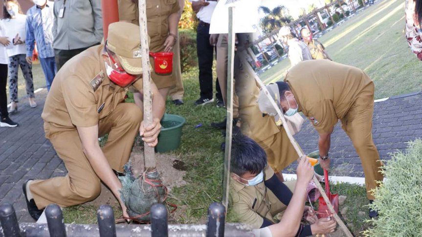 Minahasa – Bupati Minahasa DR. Ir. Royke Octavian Roring, Msi (ROR) dan Wakil Bupati Minahasa DR. (Hc). Robby Dondokambey, MM (RD) bersama alumni Sma 170 Tondano dan Komunitas Tondano Kinatouanku yang di prkarsai Irjen Pol. Drs. Carlo Brix Tewu, melakukan penanaman perdana pohon Tabebuya di Lapangan Sam Ratulangi Tondano, Senin 24 Agustus 2020.