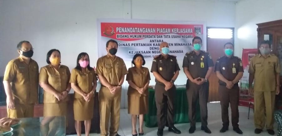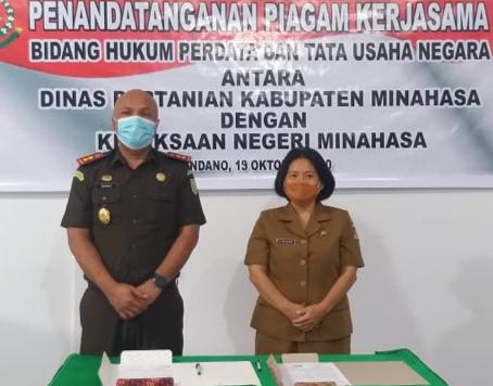 Penandatanganan piagam kerjasama ini dilakukan oleh Kepala Kejaksaan Negeri Minahasa Rakhmat Budiman, SH, MKn bersama jajaran dan Kepala Dinas Pertanian Kabupaten Minahasa DR. Ir. Margaretha Ratulangi, MAP bersama jajaran di Kantor Dinas Perrania Minahasa, Senin 19/10/2020.