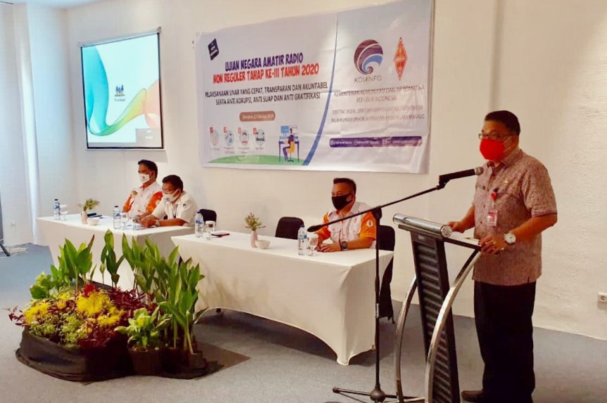 Tondano – Bupati Minahasa Dr Ir Royke Octavian Roring MSi IPU ASEAN Eng yang diwakili oleh Kepala Dinas Komunikasi dan Informatika Agustivo Tumundo SE MSi membuka dengan resmi pelaksanaan Ujian Negara Amatir Radio Non Regular Tahap III Tahun 2020 yang digelar oleh Balai Monitor Spektrum Frekwensi Radio (SFR) Kementerian Kominfo RI Kelas II Manado, pada Jumat, 23 Oktober 2020 di Hotel Yama Tondano.