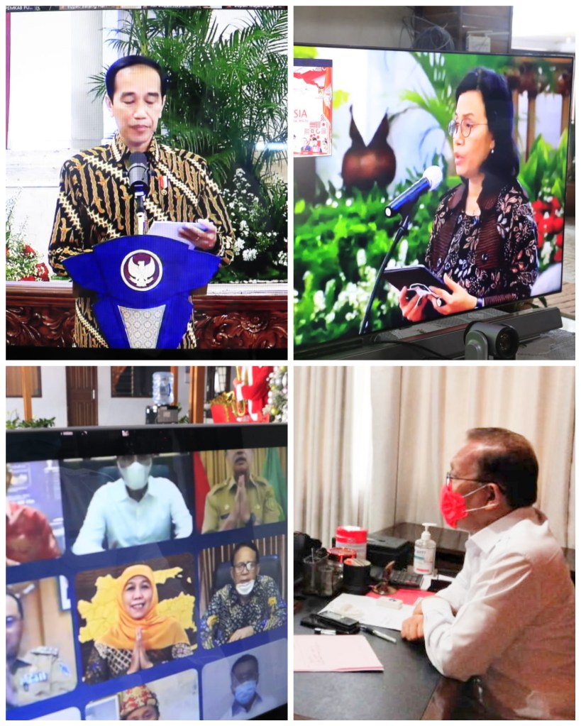 Tondano – Bupati Minahasa Dr. Ir. Royke Octavian Roring, M.Si dan Sekretaris Daerah Kab. Minahasa Frits Muntu, S.Sos mengikuti acara Penyerahan Daftar Isian Pelaksanaan Anggaran (DIPA) dan Buku daftar Alokasi Transfer ke Daerah Dan Dana Desa Tahun 2021 Oleh Presiden Republik Indonesia yang diselenggarakan lewat Video Conference menggunakan Aplikasi Zoom. Rabu, 25 November 2020.
