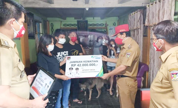 Minahasa – Bupati Minahasa Dr Ir Royke Octavian Roring M.Si menyerahkan bantuan Jaminan Kematian dari Pemerintah Kabupaten Minahasa dan BPJS Ketenagakerjan sebesar 42 juta ahli waris keluarga yang berduka atas meninggalnya almarhum Penatua Jhony Watulingas dalam Keluarga Watulingas Tenda di Desa leilem 2 Kecamatan Sonder, Senin 7 Desember 2020.