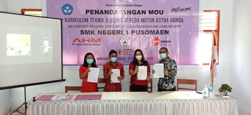 Penandatangan kerja sama antara AHM dan SMK Negeri 1 Pusomaen, Minahasa Tenggara yang berlangsung pada Kamis (17/12) ini disaksikan langsung oleh Kepala Bidang Pembinaan SMK Dinas Pendidikan & Kebudayaan Provinsi Sulawesi Utara : Debby Mamangkey S.Pd, M.A.P; Kepala Cabang Dinas Pendidikan Daerah Kab. Minahasa Tenggara & Minahasa Selatan : Bpk. Max Lengkong; Kepala Sekolah SMK Negeri 1 Pusomaen : Anna M. R. Powa, S.Pd; Main dealer PT. Daya Adicipta Wisesa akan menjadi pendamping utama pengimplementasian kurikulum di wilayah ini.