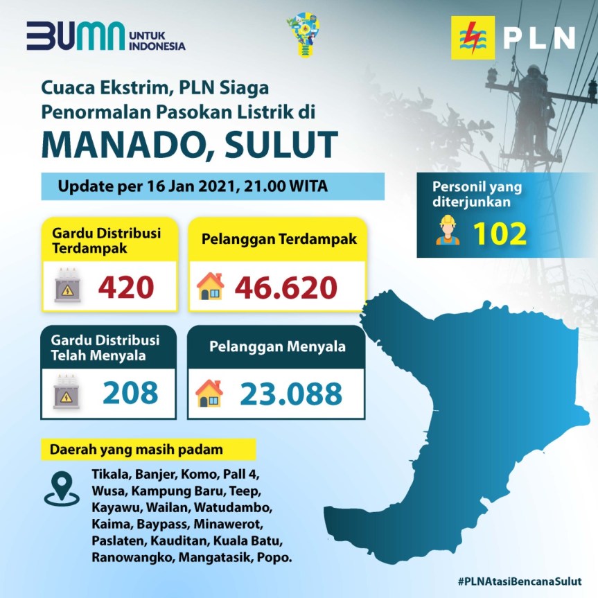 Sedangkan untuk jumlah pelanggan yang terdampak yaitu sekitar 46.620 pelanggan, PLN telah berhasil menyalakan sekitar 23.088 pelanggan, dan sekitar 23.532 pelanggan yang belum menyala.