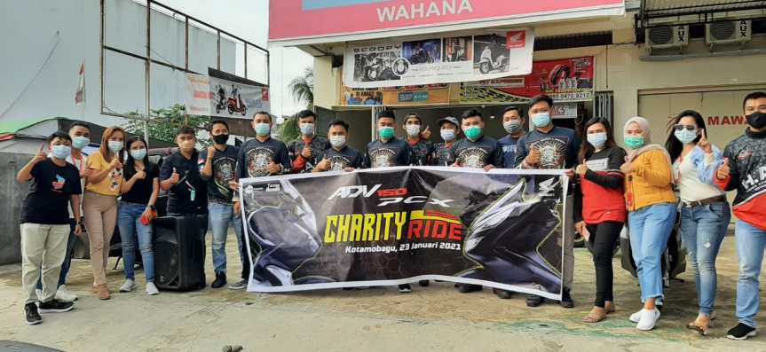 Kali ini 18 peserta yang tergabung dalam komunitas Honda ADV Indonesia (HAI) Chapter Kotamobagu dan Honda PCX Indonesia (HPCI) Chapter Kotamobagu menggelar Charity Ride dengan membagi- bagikan masker kepada pengendara motor yang melintas di 3 (tiga) titik yakni didepan pos dealer Tridjaya Motor, Daya Motor dan Wahana Kotamobagu.